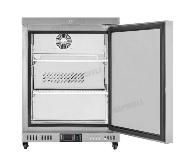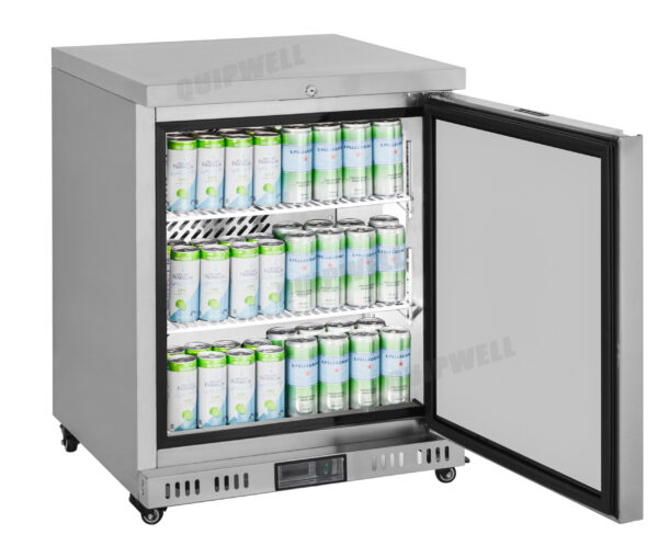 - Design: Rear-mounted heavy-duty compressor for deep under-counter cold storage. Space-saving horizontal chilled storage which fits easily under countertops. Modern design with integrated stainless steel benchtop and a solid stainless steel door.